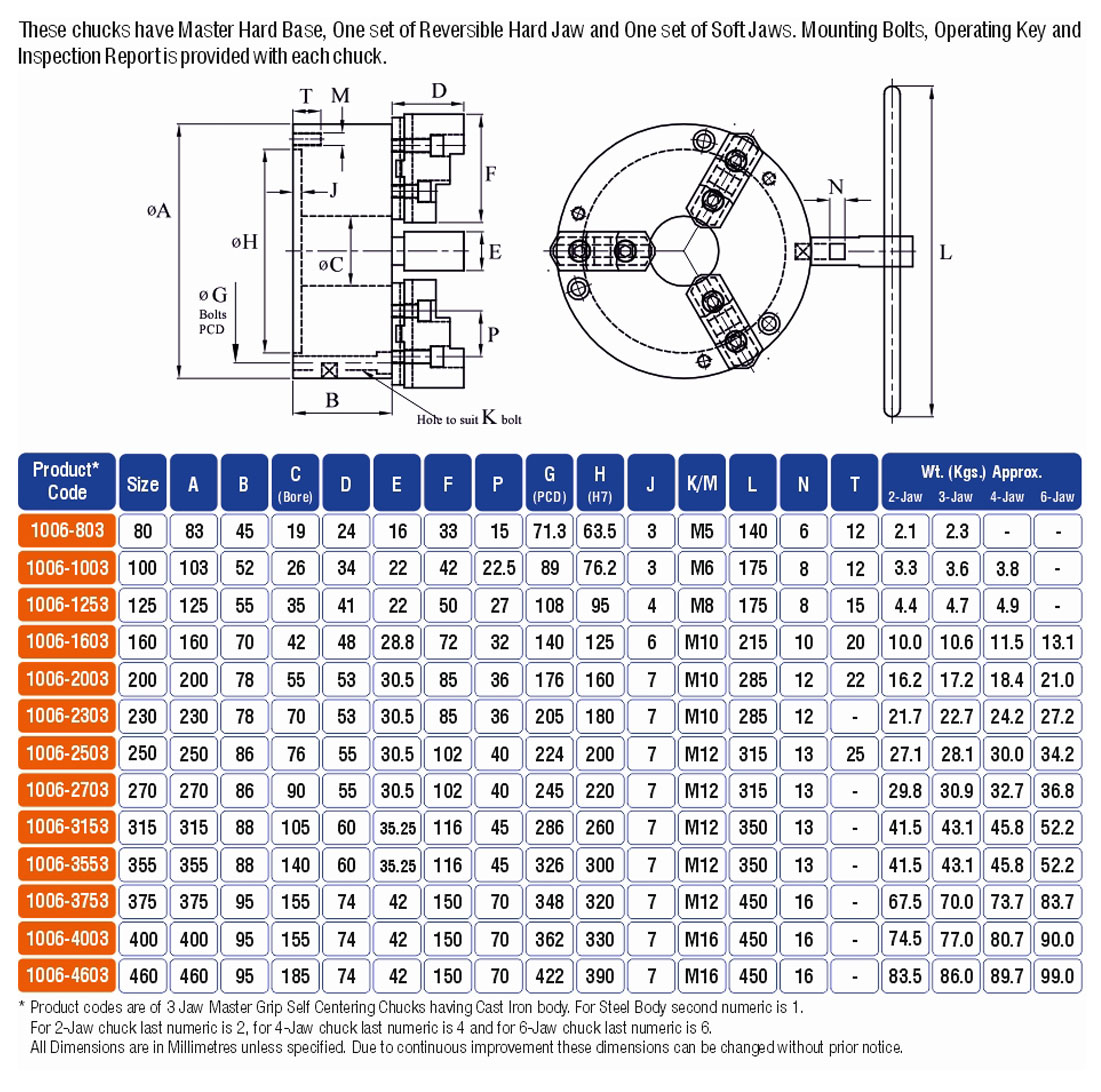 In these chucks the jaws are made in two portions. The one is base hard jaw fitted in the body. One set of top hard reversible and one set of top soft jaw are supplied with each chuck. Top hard reversible & top soft jaws are mountable on the same base hard jaw with allen bolts provided with the chuck. The advantage of these chucks are that user can modified the